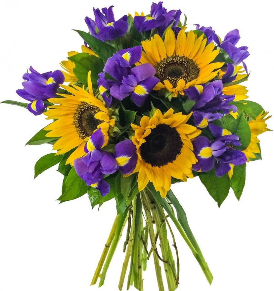 Изумительный букет из солнечных подсолнухов и великолепных красочных ирисов наполнит жизненной силой, оптимизмом, пробудит чувственность и романтичность. Этот букет прекрасно подходит для романтического свидания  и для подарка любимой женщине ко Дню её Рождения, к празднику или другому важному событию.